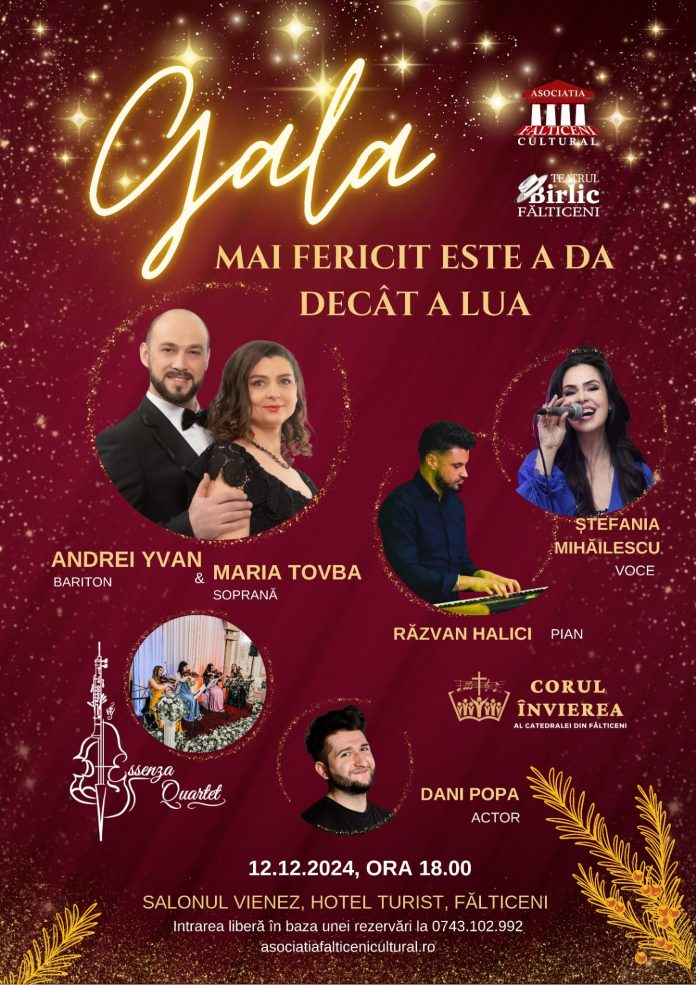 Ziua de 12 decembrie este dedicată Galei ”Mai fericit este a da decât a lua”. Evenimentul este organizat de Asociaţia Fălticeni Cultural şi va avea loc în Sala Vieneză a Hotelului Turist din Fălticeni, începând cu ora 18.00.